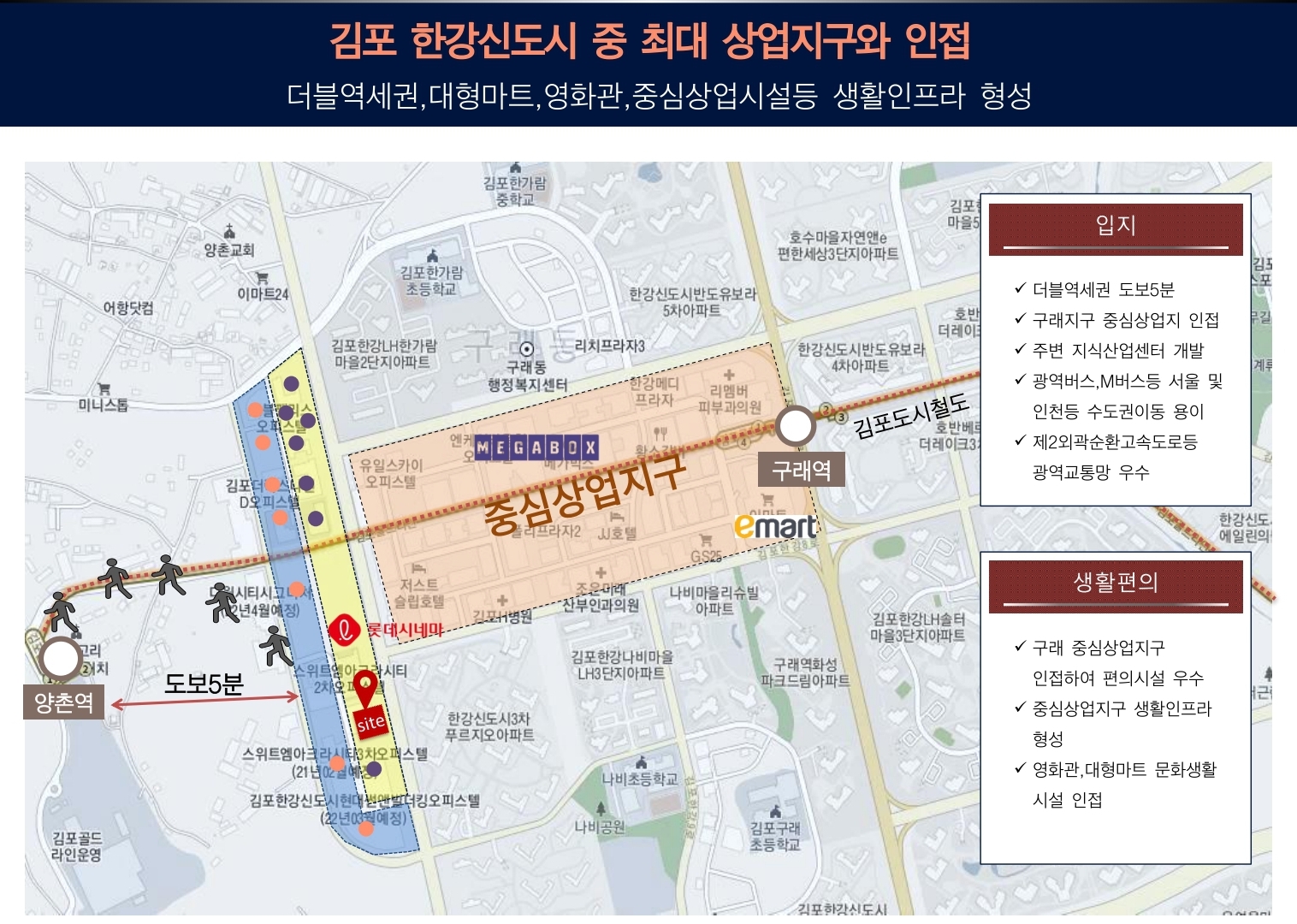 특히 구래역과 양촌역을 모두 도보로 이용할 수 있는 더블역세권 입지로, 서울, 인천, 일산 등 수도권 주요 도시로의 접근성이 매우 뛰어납니다. 김포골드라인, 광역버스, 제2외곽순환고속도로 등 다양한 교통망이 연결되어 있어 출퇴근과 외출이 편리합니다. 앞으로 GTX-D 노선, 5호선 연장 등 추가 교통 호재도 예정되어 있어 미래가치가 더욱 높아질 것으로 기대됩니다.